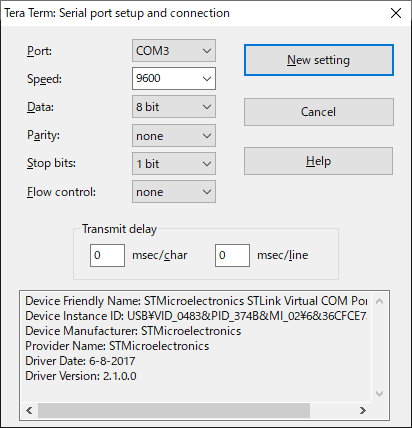 By using Tera Term and selecting STMicro’s VCP (Virtual COM Port), you can easily set up a communication environment.