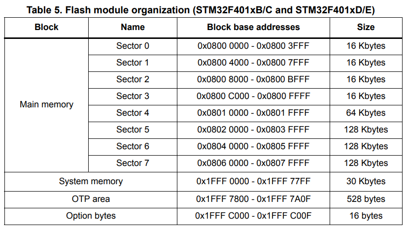 The sector structure of the STM32F401RE is as follows