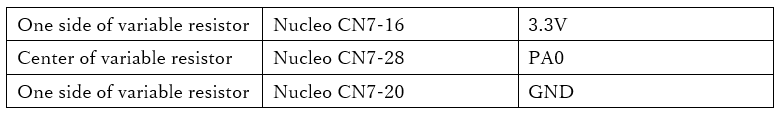 Connect the center of the variable resistor to the PA0 pin to read the analog voltage.