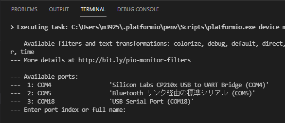 画面下部の TERMINAL に以下の表示が出たら、Silicon Labs CP210x USB to UART Bridge の番号(この場面では 1)を指定します。