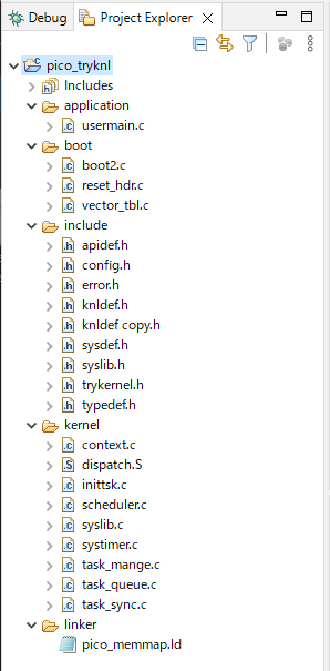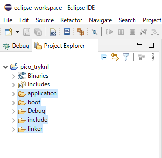 C:\DevTools\src\IF2307TK\part_4\sect_2 下にある以下のフォルダを全て選択して、IDEの Project Explorer の pico_tryknl にドラッグ&ドロップします。