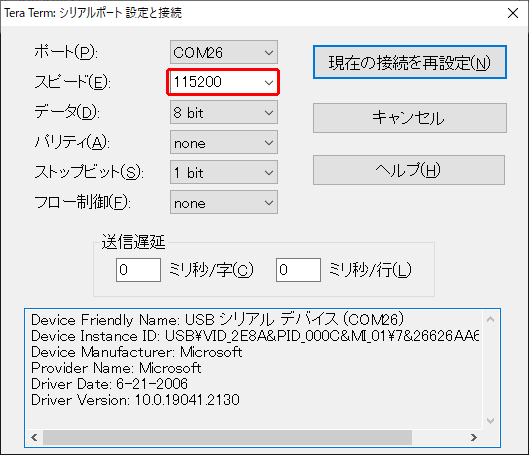設定 – シリアルポート でスピートを 115200 に設定します。(それ以外は以下の設定)