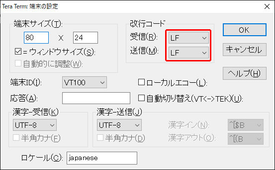 設定 – 端末 で改行コード 受信・送信を LF に設定します。(改行して表示を見やすくします)