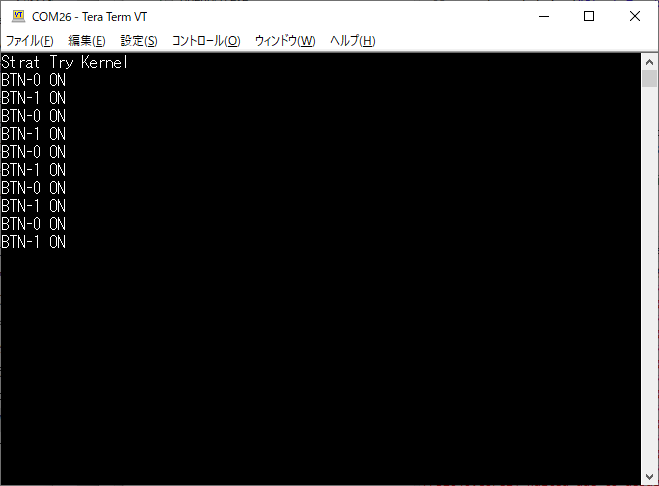 その後、スイッチを交互に押すたびに “BTN-0 ON” , “BTN-1 ON”が交互に表示されれば成功です。