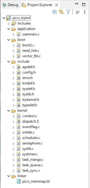 C:\DevTools\src\IF2307TK\part_4\sect_3 下にある以下のフォルダを全て選択して、IDEの Project Explorer の pico_tryknl にドラッグ&ドロップします。