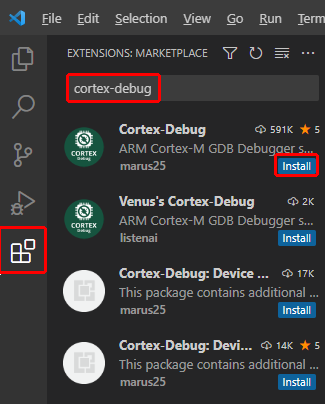 VS Codeを起動し、左の赤枠のアイコンをクリックして拡張機能マーケットプレイスを表示させて、枠内に cortex-debug と入力し install ボタンを押します。