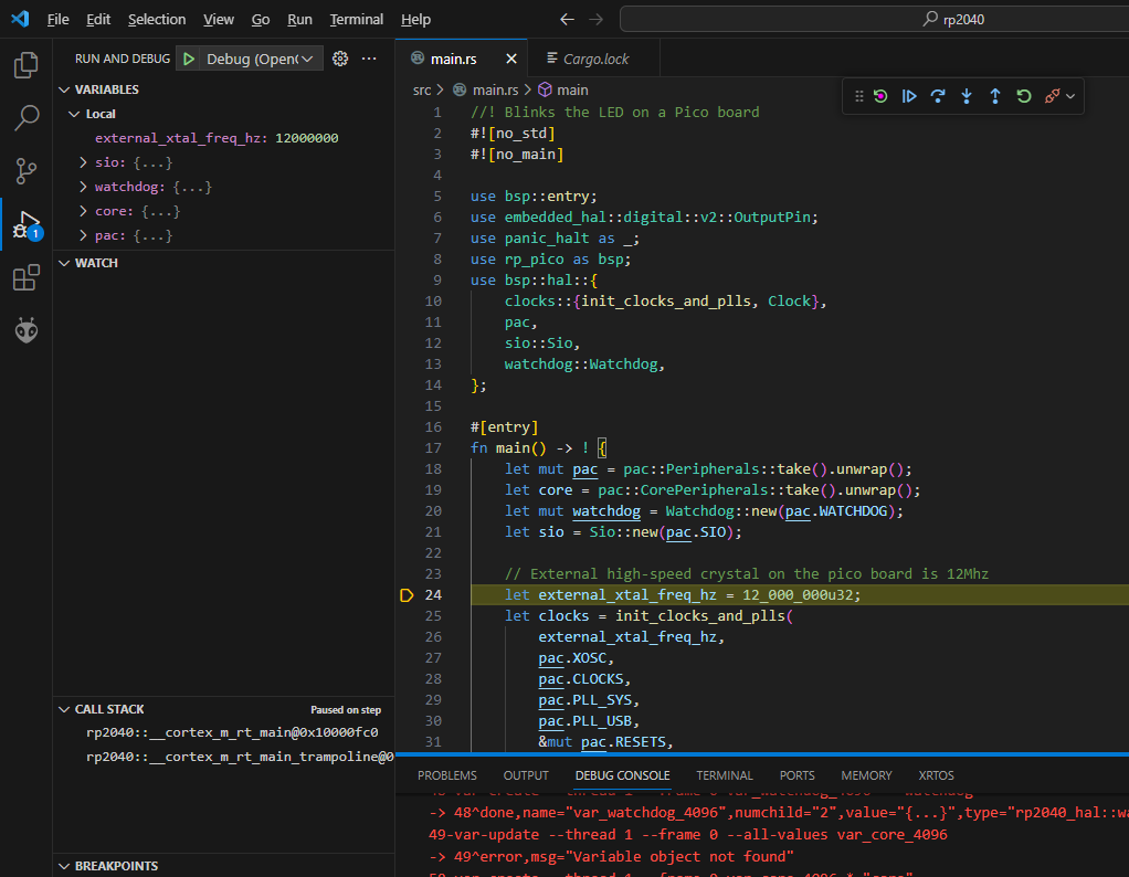 main.rs の #[entry] の部分で停止し、フローティングバーが表示されれば成功です。