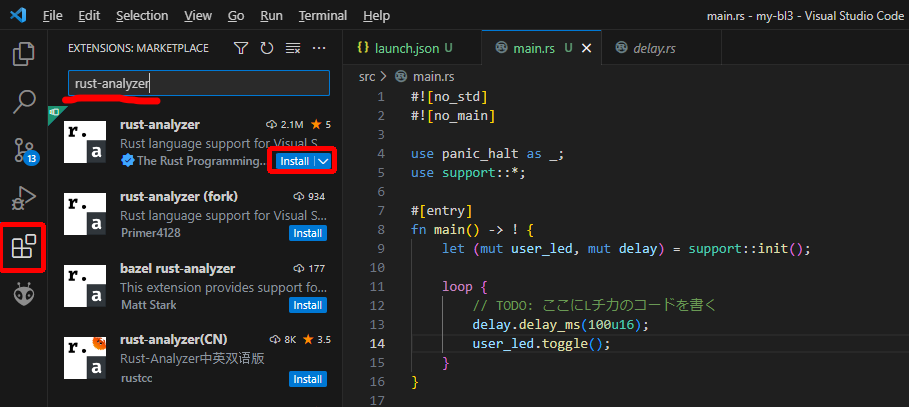 VS Codeを起動し、左の赤枠のアイコンをクリックして拡張機能マーケットプレイスを表示させて、枠内に rust-analyzer と入力し install ボタンを押します。