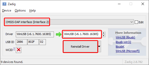 長いコンボボックスで CMSIS-DAP interface(Interface2) を選択し、ドライバで WinUSB を選択します。