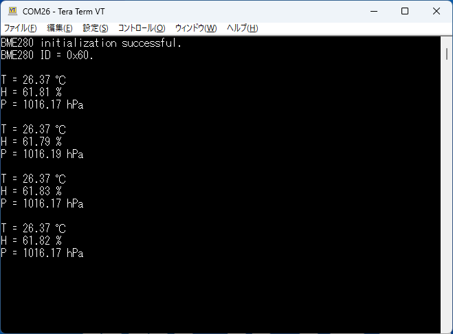 初期化成功のメッセージの後、約1秒毎に温度、湿度、気圧の値が表示されれば成功です。