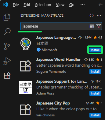 Ctrl + Shift + X でサイドバーに拡張マーケットプレイスを表示させた状態で検索バーに japanese と入力し、候補に出てきた Japanese Language Pack for Visual Studio Code のinstallボタンを押します。