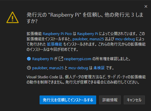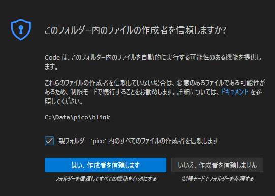 ダウンロードが終わると次のウィンドウが出るので「親フォルダー’pico’内のすべてのファイルの作成者を信頼します」にチェックを入れて、「はい、作成者を信頼します」のボタンをクリックします。