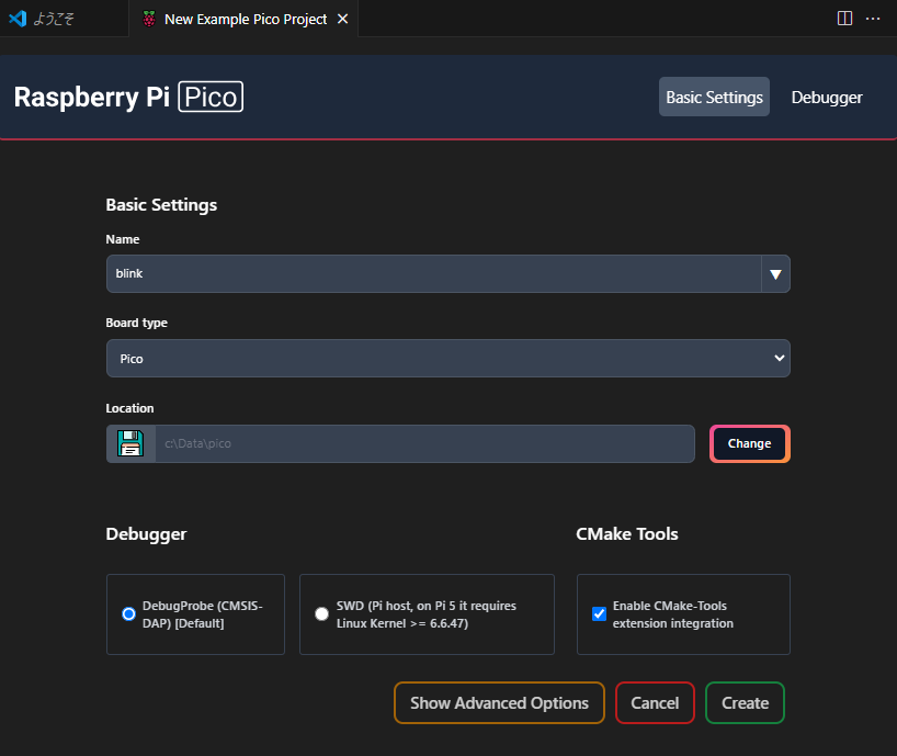 それから Debugger は DebugProbe(CMSIS-DAP)[Default]を選択し、CMake Tools の Enable CMake-Tools extension integration にチェックを入れて Createボタンを押します。