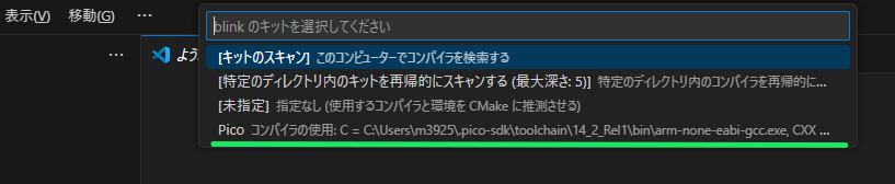 続いて blinkのkitを選択してください と言われるので、一番下の Pico コンパイラの使用: C=… を選択します。