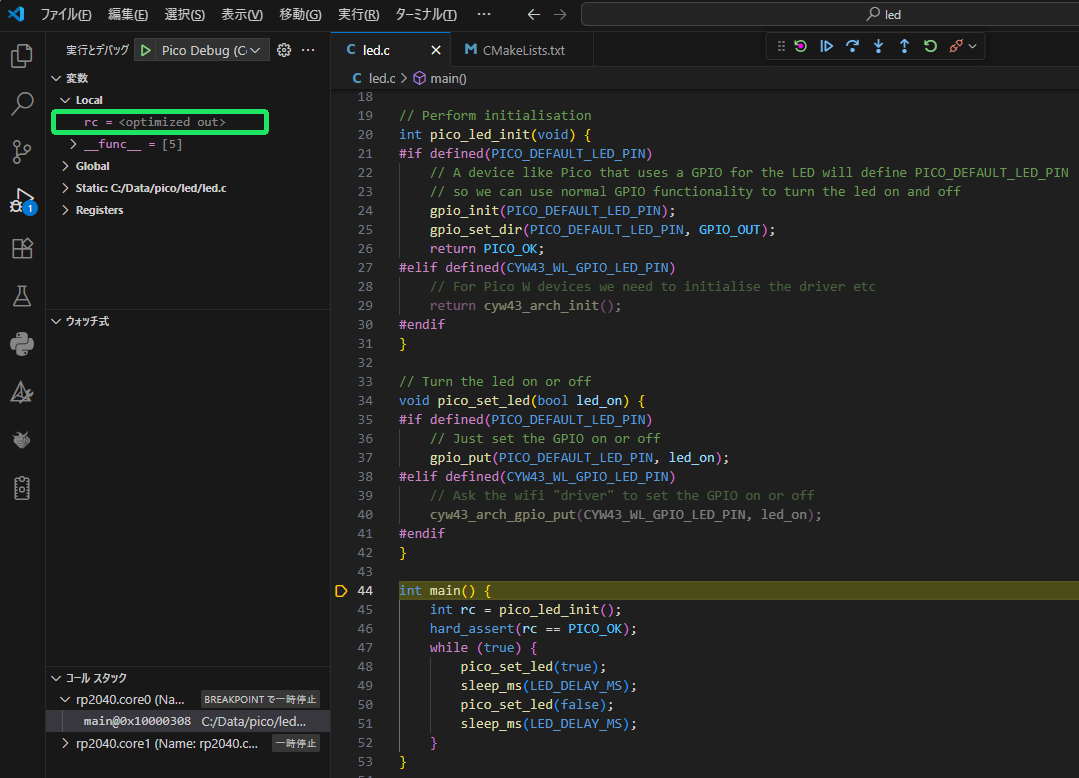 F10キーでステップ実行を2回繰り返し pico_led_init()関数を実行し終えたところで rc = 0 になりました。