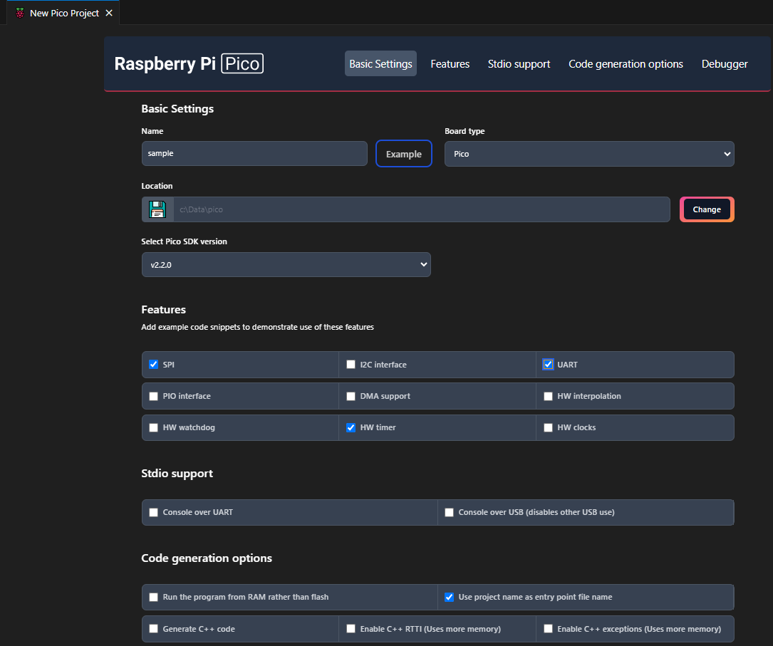 Features では SPI, UART, HW Timer の3つにチェックを入れます。
