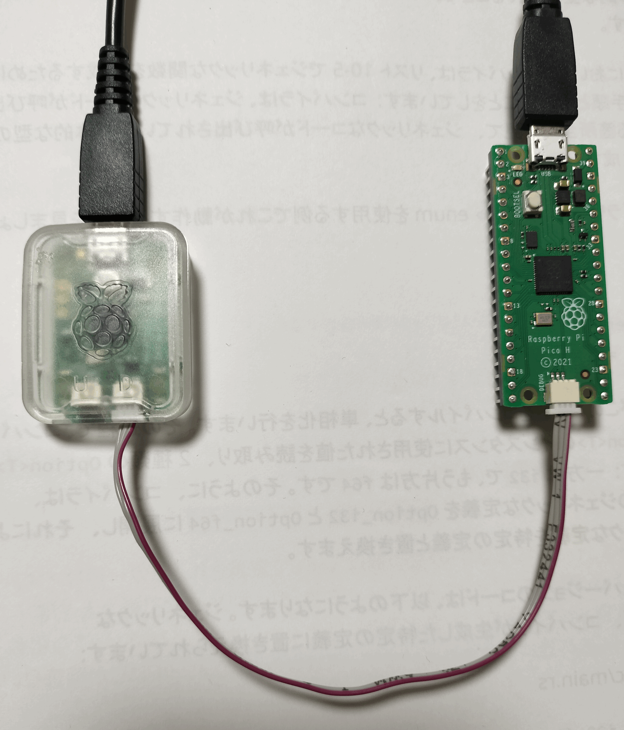 Debug Probe(左)とラズピコ(右)を接続した様子を以下の画像で確認してください。