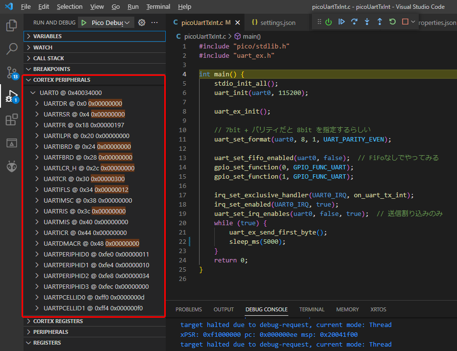 なお、デバッグを開始するとペリフェラル・レジスタの値を CORTEX PERIPHERALS から確認することができます。