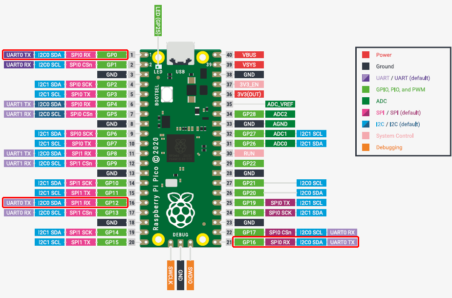 UART0は赤枠で囲ったいずれかのピンで使うことができます。