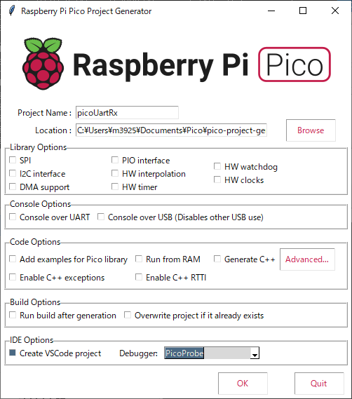 こちらの環境では C:\Users\m3925\Documents\Pico\pico-project-generator\picoUartRx です。