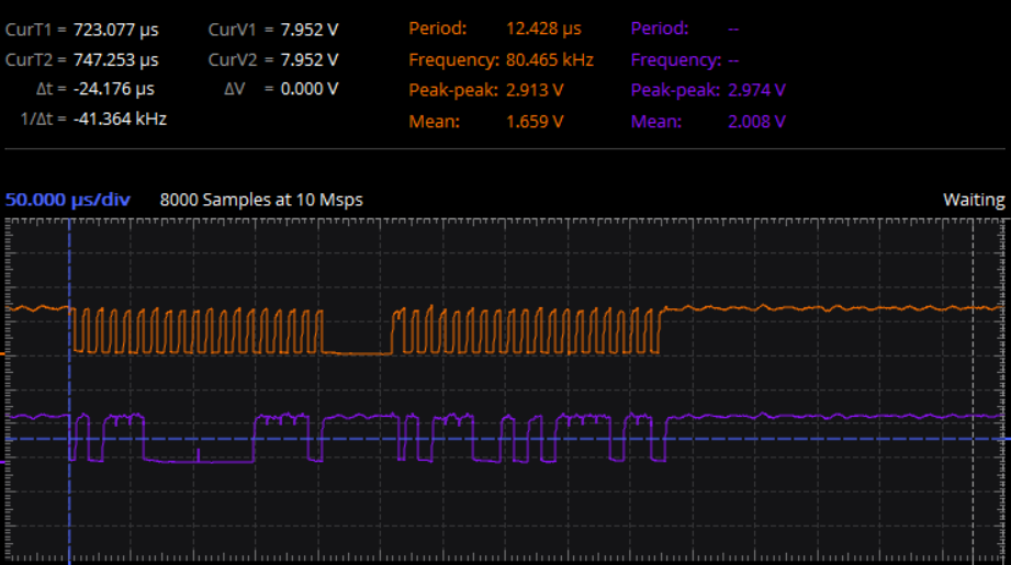それから起動時に WHO_AM_I を送りコードが戻ってきた様子を観測した波形も貼っておきます。