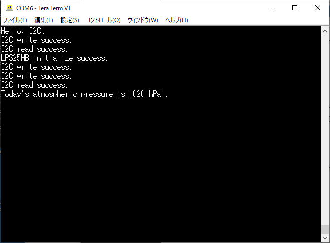 読んできた3バイトを合成して 4096 で割ると気圧[hPa]を得ることができます。