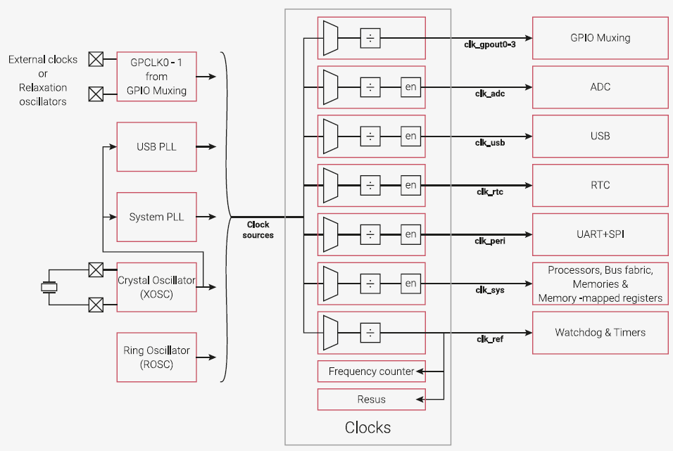 ラズピコのマイコン RP2040 のクロック系統図を以下に示します。