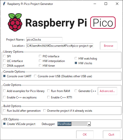 こちらの環境では C:\Users\m3925\Documents\Pico\pico-project-generator\picoI2c です。
