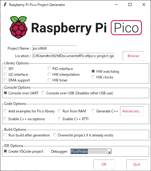 こちらの環境では C:\Users\m3925\Documents\Pico\pico-project-generator\picoWdt です。