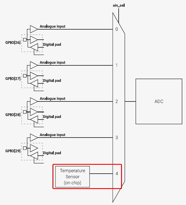 ラズピコのマイコン RP2040 には電圧出力の温度センサーが内蔵されていてADCにつながっています。