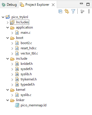 C:\DevTools\src\IF2307TK\part_2\sect_4 下にある以下のフォルダを全て選択して、IDEの Project Explorer の pico_tryknl にドラッグ&ドロップします。