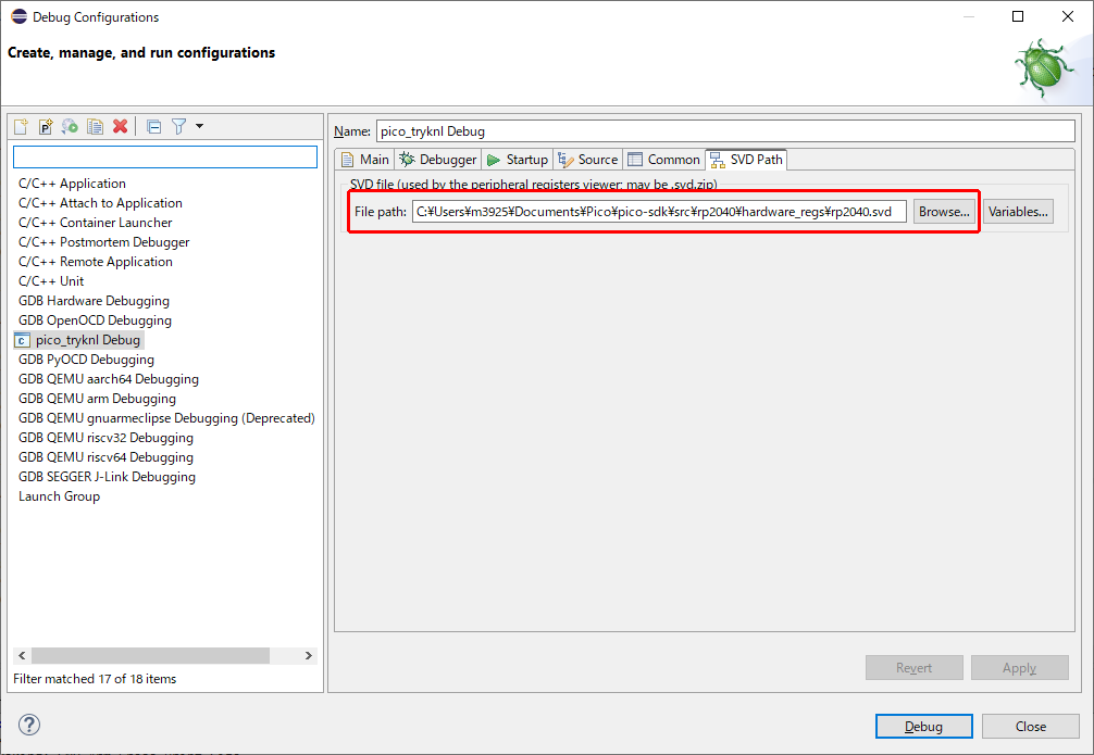 Run – Debug Configurations で SVD Pathのタブを選択し、Browseボタンから RP2040.svd を指定します。