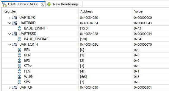 そうすると下のペインのMemoryタブに UART0 のレジスタが出てきます。