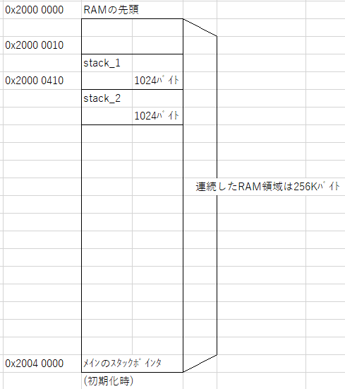 RAMの先頭から stack_1 までに少し隙間がありますが、これはたまたま stack_1の宣言前に他の変数を使っているためです。